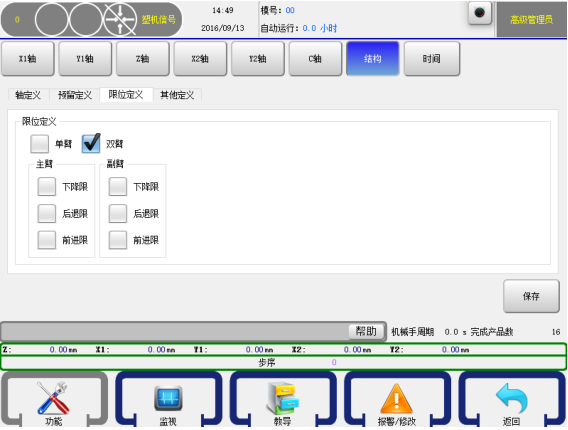 副臂:下降限,后退限,前進限。若副臂為氣動軸,則限位有效,當相應的氣動軸動作時,必須有限位信號,程序才會執行下一步。否則報警超時。